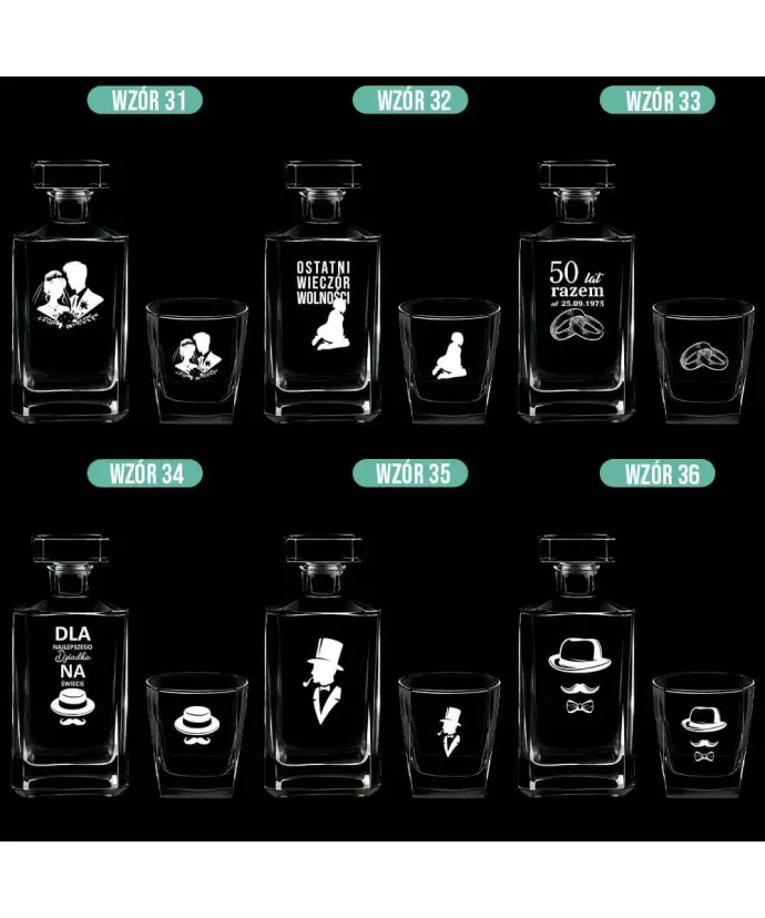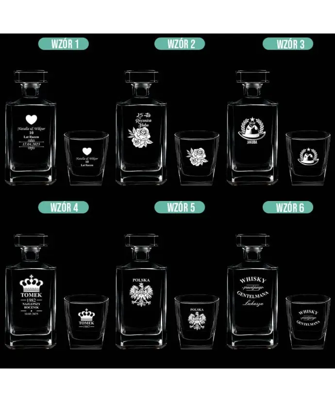 Our offer includes a wide selection of personalized whisky sets with engraving, which are distinguished not only by their high quality but also by their elegant appearance. Crystal glass, precise workmanship and the possibility of adding an individual dedication make each decanter with glasses a unique product. Order your set today and give your loved ones something truly unique or add it to your collection.