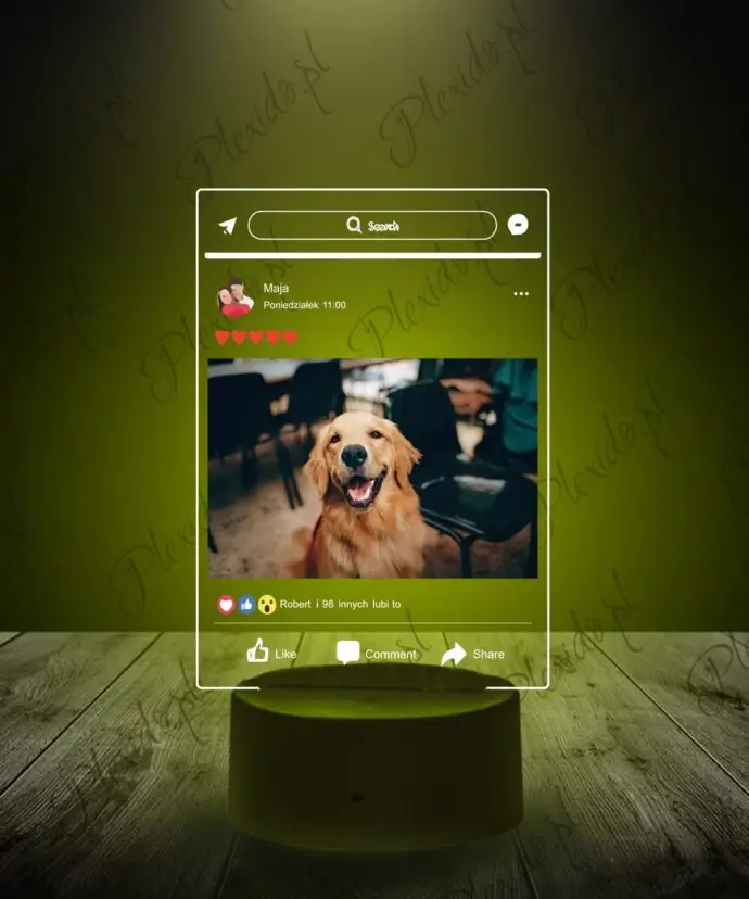 Na eleganckiej tabliczce ze stojakiem widnieć będzie przesłane przez Państwa zdjęcie, ale również wybrany tekst oraz liczba polubień i komentarzy.