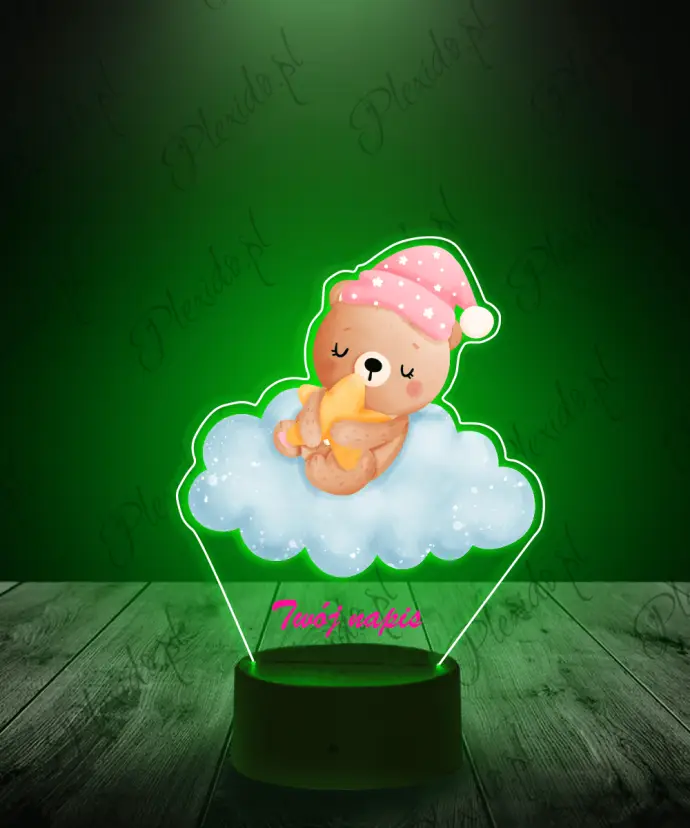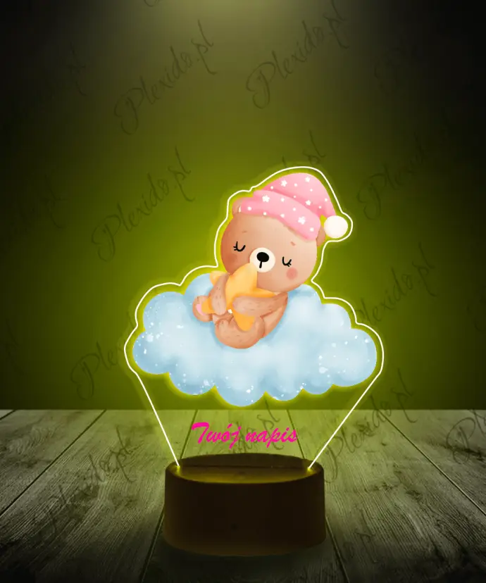 3D-Plexido-LED-Lampe mit Teddybär auf einer Wolke, rosa